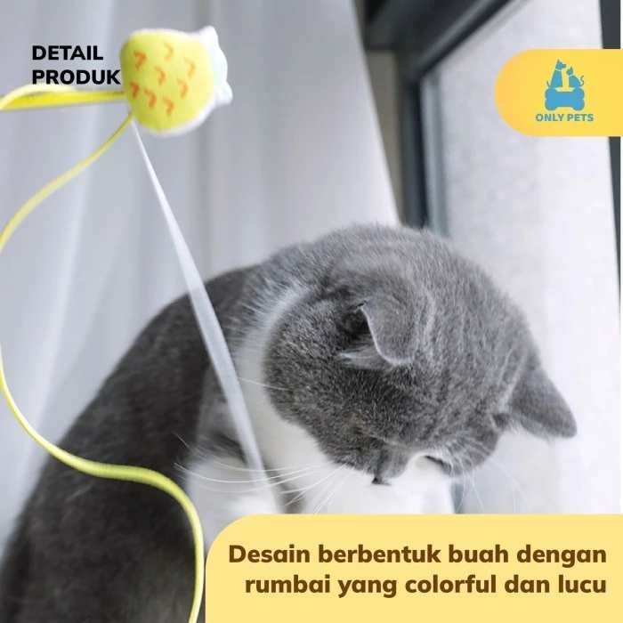Fruit Wand Cat Teaser adalah mainan kucing yang berbentuk tongkat dengan berbagai macam bentuk buah yang unik, lucu, dan colorful. Pawparents bisa memilih sendiri bentuk dan juga warna sesuai selera untuk anabul kesayangan. Mainan ini memiliki panjang tongkat kurang lebih berukuran 30 cm dengan panjang rumbai 40 cm. Mainan ini dilengkapi dengan liontin lonceng yang dapat berbunyi untuk menarik perhatian anabul, sehingga cocok digunakan untuk menggoda anabul ketika hendak mengajaknya bermain.