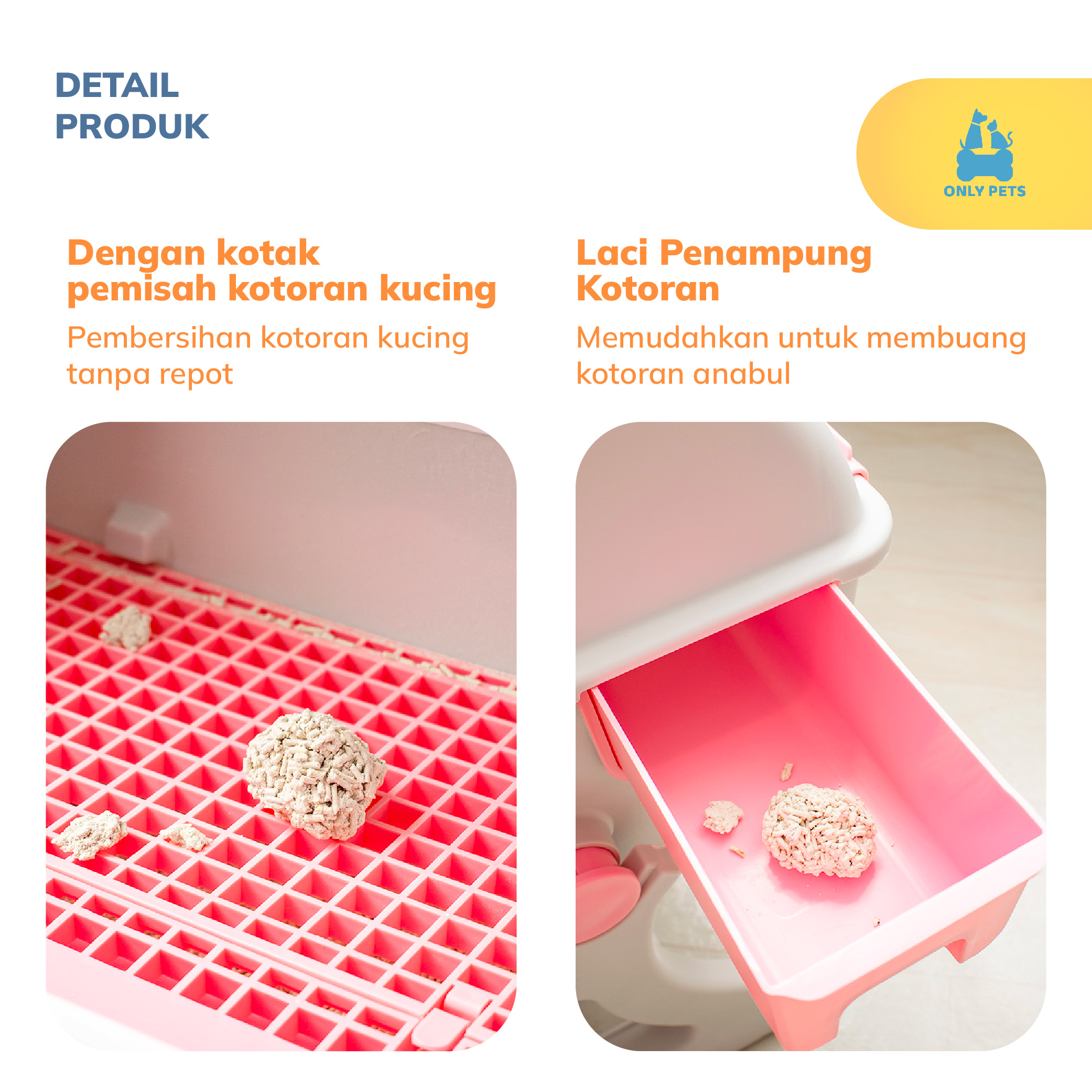 Rawat anabul Pawparents dengan mudah menggunakan Litter Box Kucing Semi Otomatis dari Only Pets. Desain inovatif memastikan lingkungan anabul tetap bersih tanpa repot. Dengan sistem penyaringan otomatis, kotoran akan terpisah dari pasir, memberikan kemudahan dalam pembuangan poopnya.